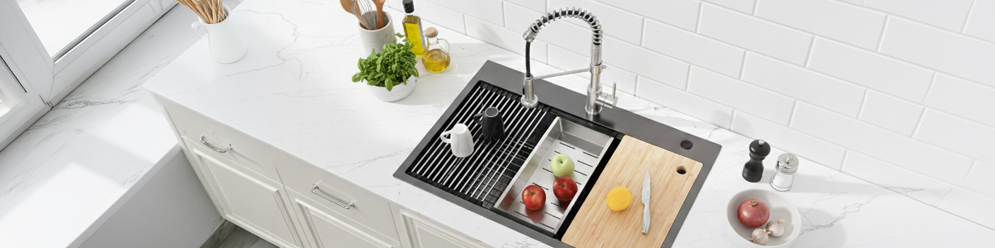Key Features: Workstation Ledge: Integrated track for sliding accessories to maximize counter space. Premium 304 Steel: Heavy-duty construction resists r...